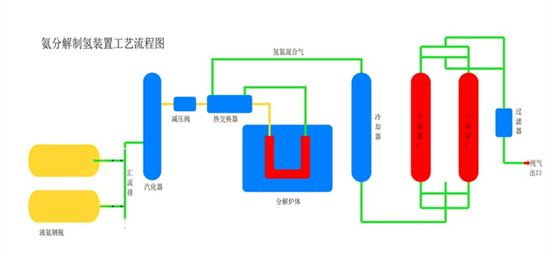 氨分解制氫是以液氨為原料,在鎳催化劑的作用下,加熱800℃-850℃分解得到含氫75%,含氮25%的氫氮混合氣體。分解率可以達(dá)到99.9%。露點(diǎn)為-10℃。