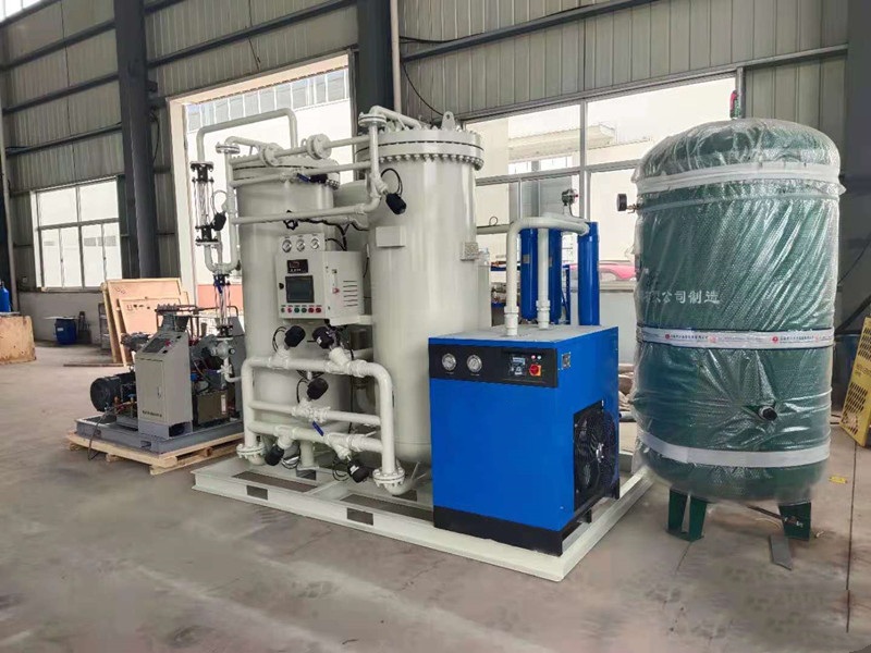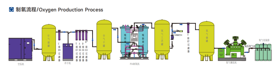 變壓吸附制氧裝置以潔凈的壓縮空氣為原料,采用高品質(zhì)的沸石分子篩作為吸附劑,在一定的壓力下,從空氣中制取氧氣。經(jīng)過純化干燥的壓縮空氣,在吸附器中進行加壓吸附、減壓脫附。由于空氣動力學效應,氮在沸石分子篩微孔中擴散速率遠大于氧,氮被沸石分子篩優(yōu)先吸附,氧在氣相中被富集起來,形成成品氧氣。然后經(jīng)減壓至常壓,吸附劑脫附所吸附的氮氣等雜質(zhì),實現(xiàn)再生。一般在系統(tǒng)中設置兩個吸附塔,一塔吸附產(chǎn)氧,另一塔脫附再生,通過PLC程序控制器控制氣動閥的啟閉,使兩塔交替循環(huán),從而取得純度較高的氧氣(93%±3%)。